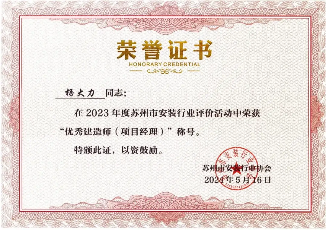 工程部项目经理杨大力被评选为"2023年度优秀建造师"