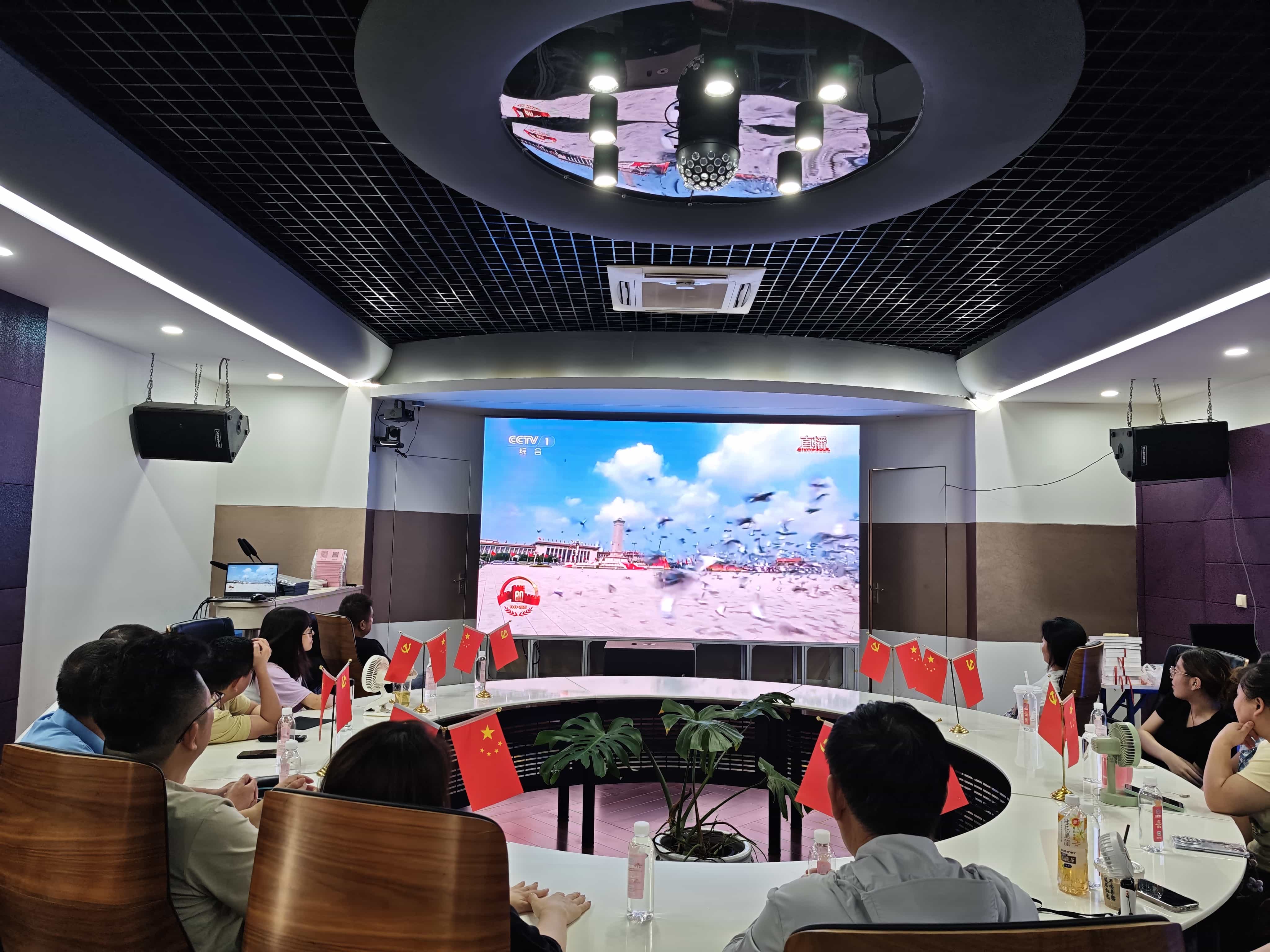 公司会议室内,大家整齐就坐,怀着无比激动和自豪的心情收看阅兵盛况。当雄壮的国歌声响起,全体人员自发起立,共同高唱国歌,表达对祖国的热爱与敬意。